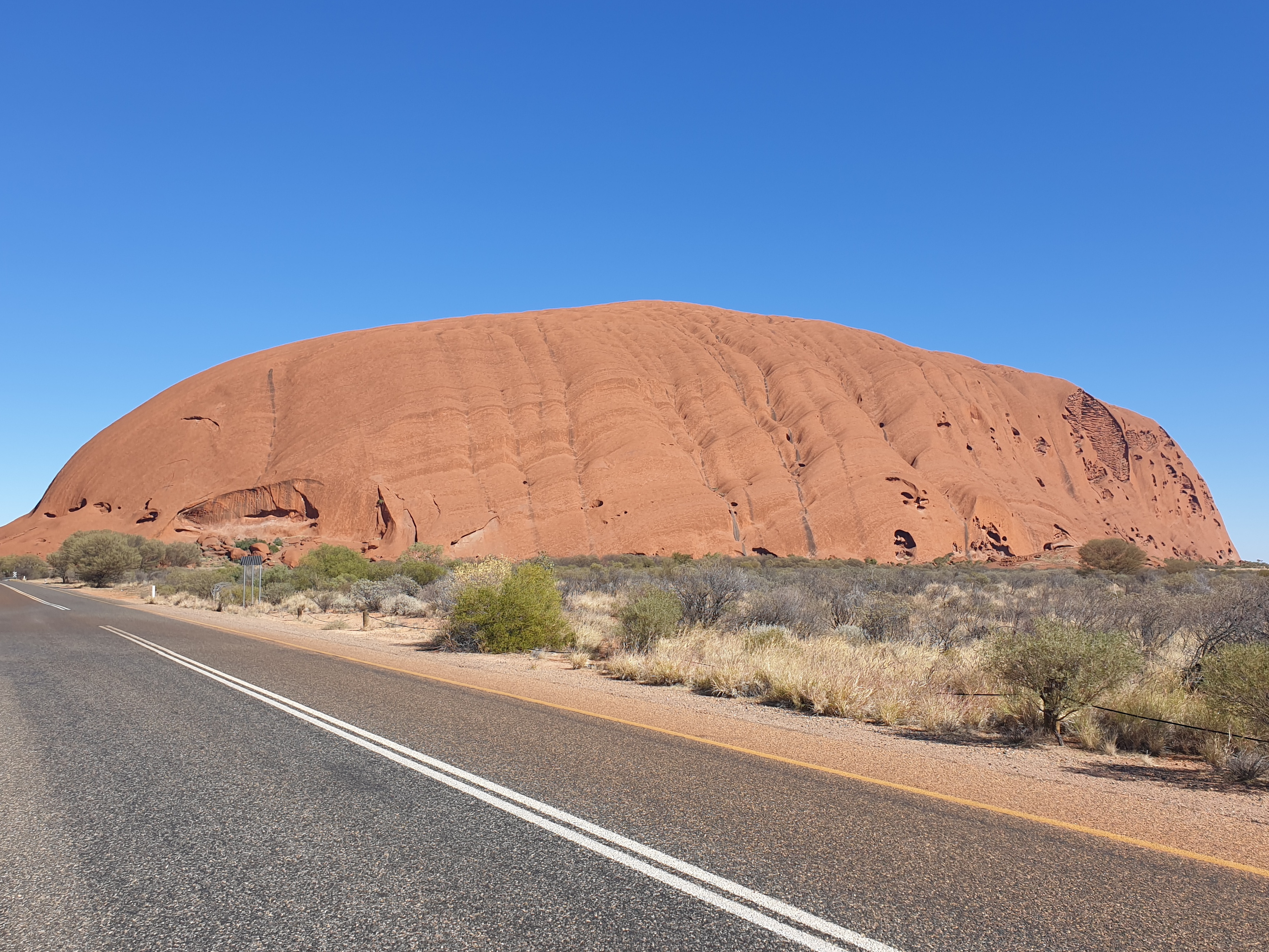 Der Uluru Kata Tjuta National Park➚ umfasst heute ein Gebiet von gut 1.300㎢ ziemlich genau in der Mitte von Australien, im sogenannten “Roten Zentrum” und dem südlichen Teil des Northern Territory von Australien. Aus der roten Wüste ragt ein riesiger Monolith, der Ayers Rock, oder korrekter der Uluru, wie er in der Sprache des hier heimischen Anangu Volkes heißt. Uluru ist eines der bekanntesten Naturwunder Australiens und es war atemberaubend sich dem Uluru zum ersten Mal zu nähern. Uluru ist einfach unbeschreiblich beeindruckend.