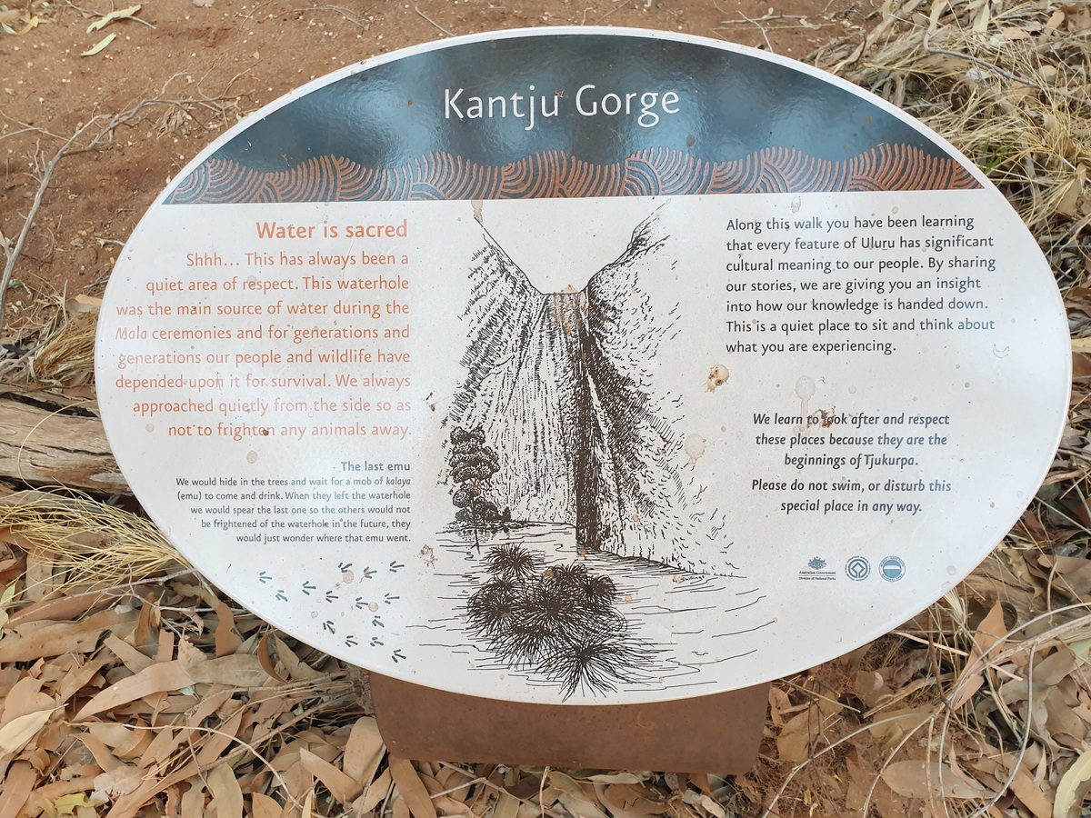 Der Uluru Mala Walk führt zur Kantju-Schlucht aus steilen roten Felswänden. Dieser Spaziergang (ca. 2km) bietet Ausblicke auf Höhlenstrukturen und Felsmalereien der Aborigines vom Volk der Pitjantjatjara. Auf Schautafeln bei den einzelnen Höhlen wird gut erklärt welchem Zweck die Höhlen den Ureinwohnern dienten, z.B eine Küche oder ein Klassenzimmer.
