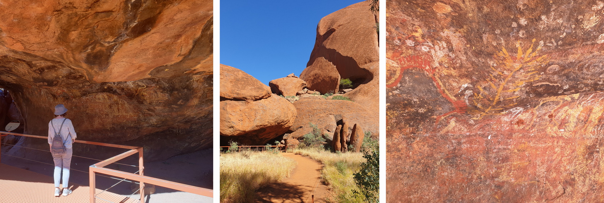 Uluru ist ein wichtiger spiritueller Ort, heilig für die Anagu-Ureinwohner. Es befinden sich in den Wänden viele Höhlen, die verschiedenen Zwecken dienten und die mit uralter Felsmalereien bemalt sind. Man kann den Monolithen ganz umrunden (ca. 10km) auf dem Uluru Base Walks oder nur kürzere Wanderungen machen. Wir machten den Uluru Mala Walk und den Kuniya Walk zum Muṯitjulu Waterhole.